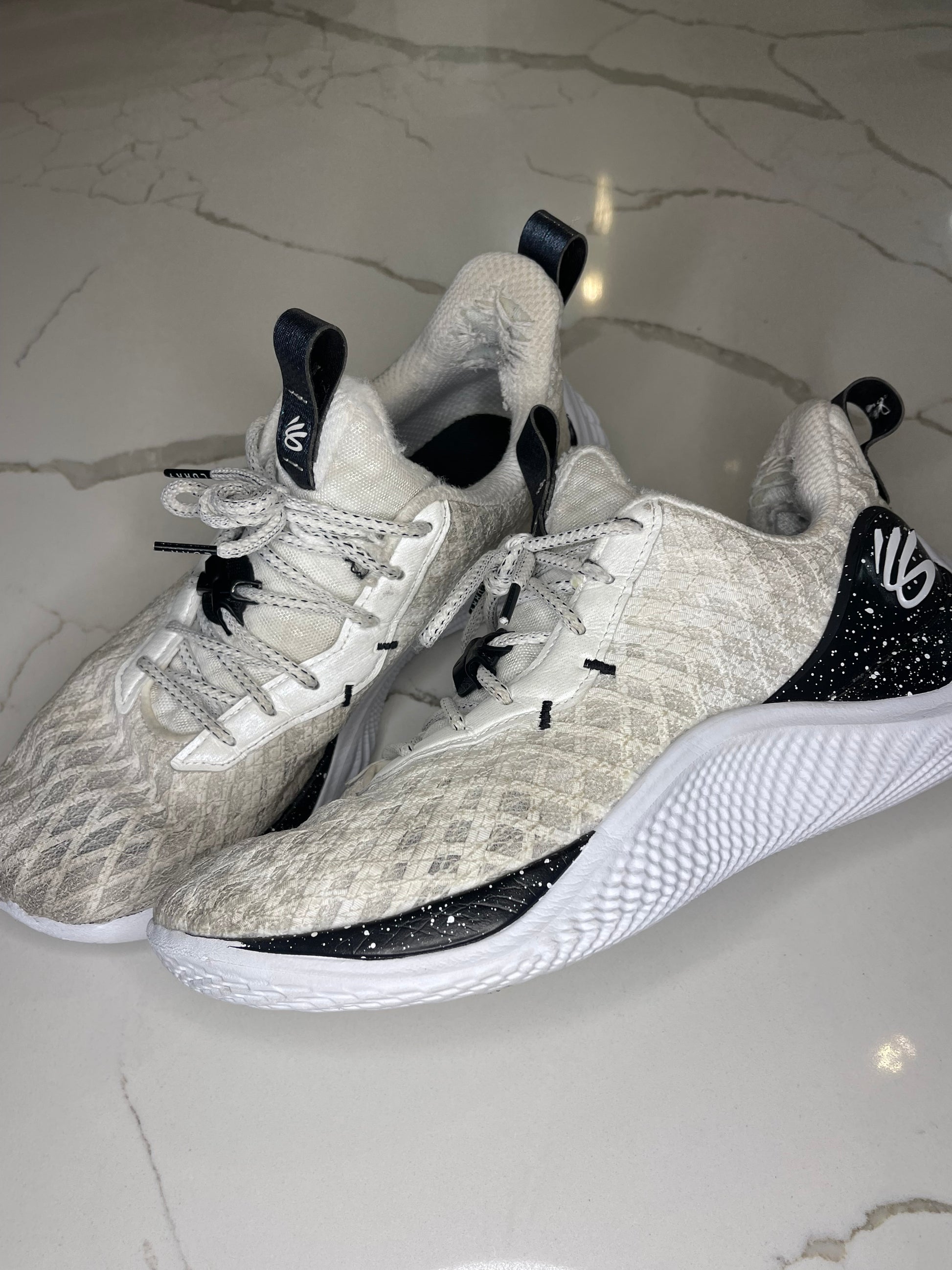White and black Under Armour Curry Basketball/Volleyball court shoes.