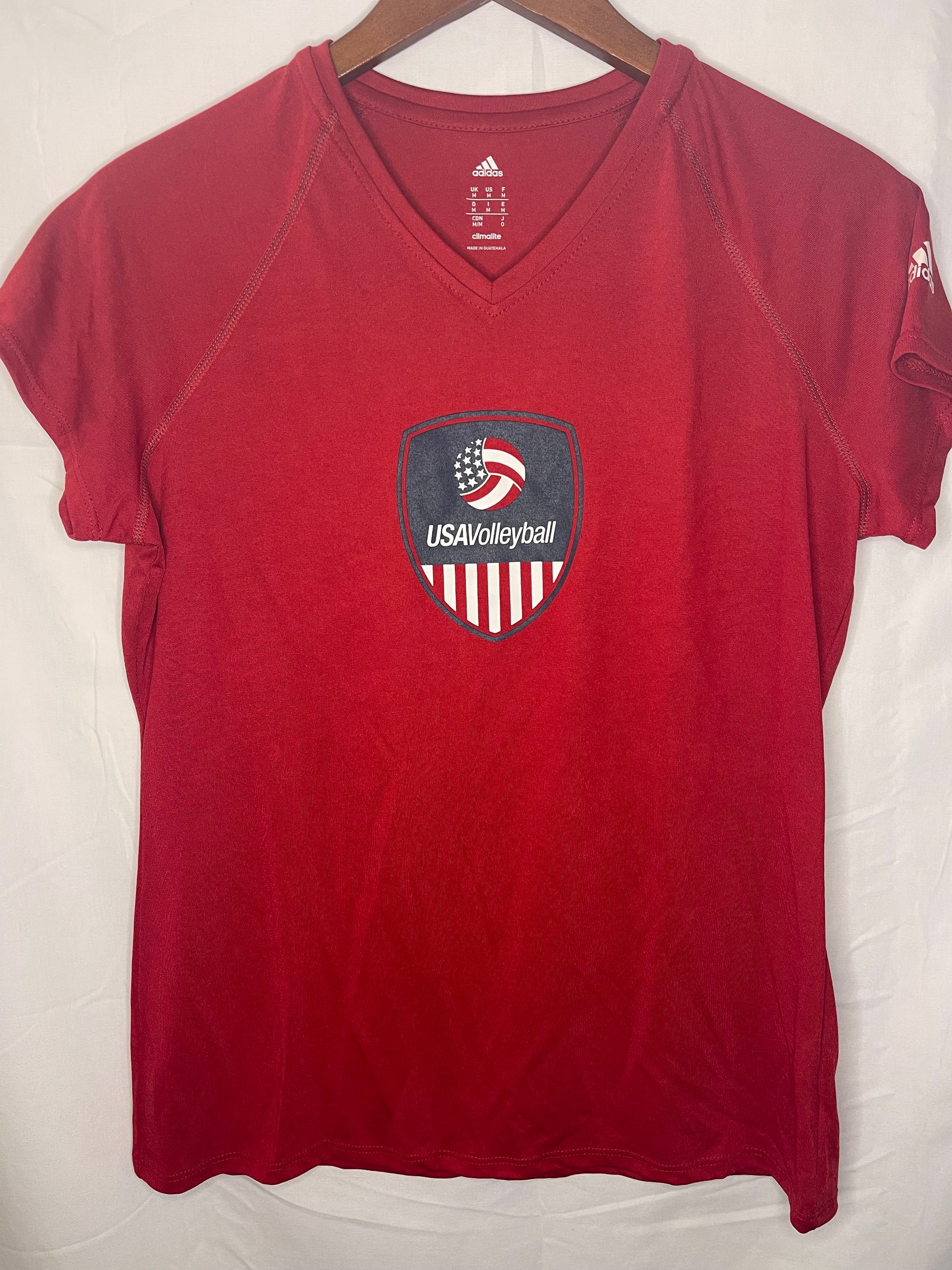 Red Adidas v-neck dry-fit t-shirt. From Youth National Team training in Florida summer 2017. Players that went to the opening ceremony for the event wore this as their uniform.