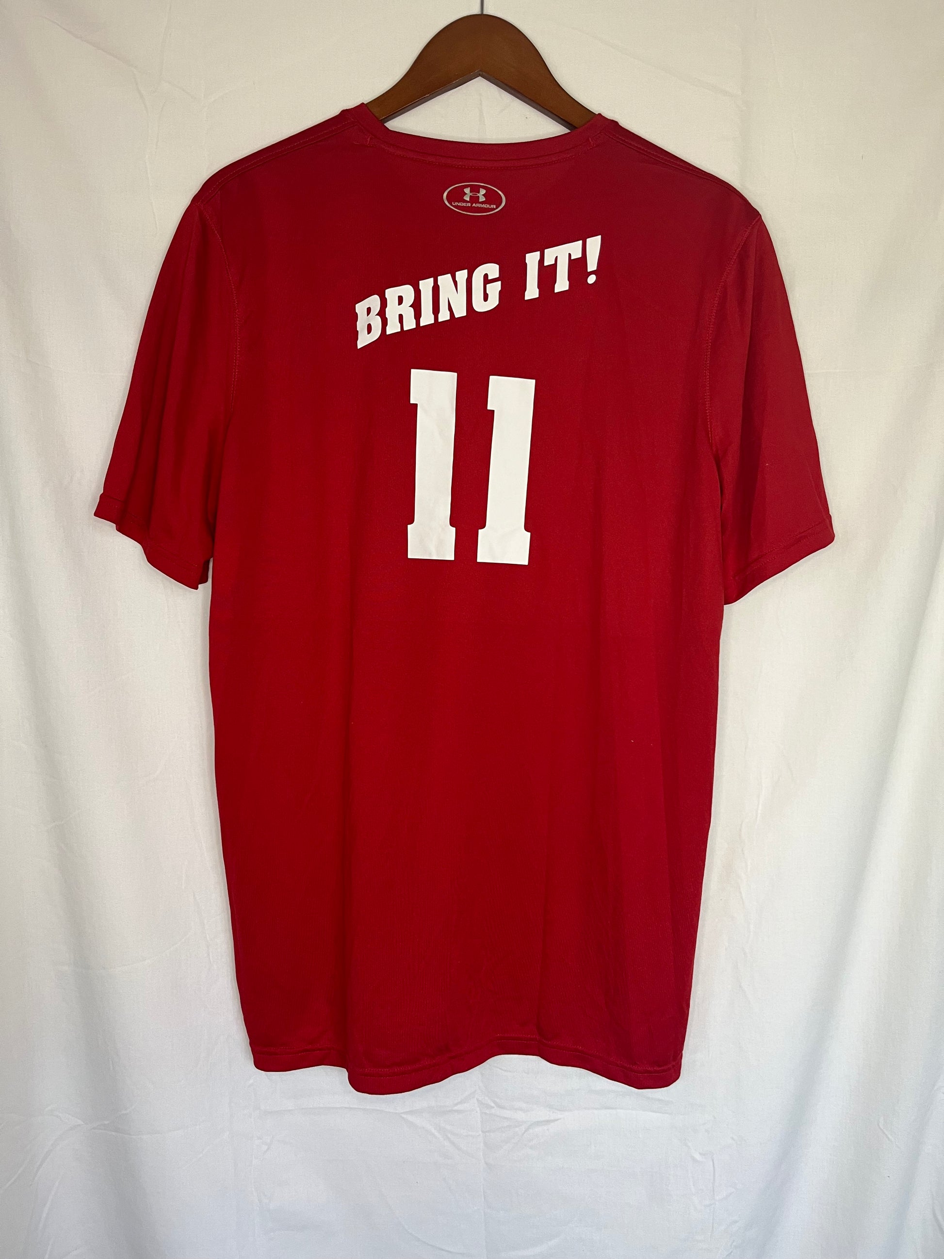 Red dry-fit short sleeve practice shirt. Under Armour. Number 11 and Bring it! On the back.